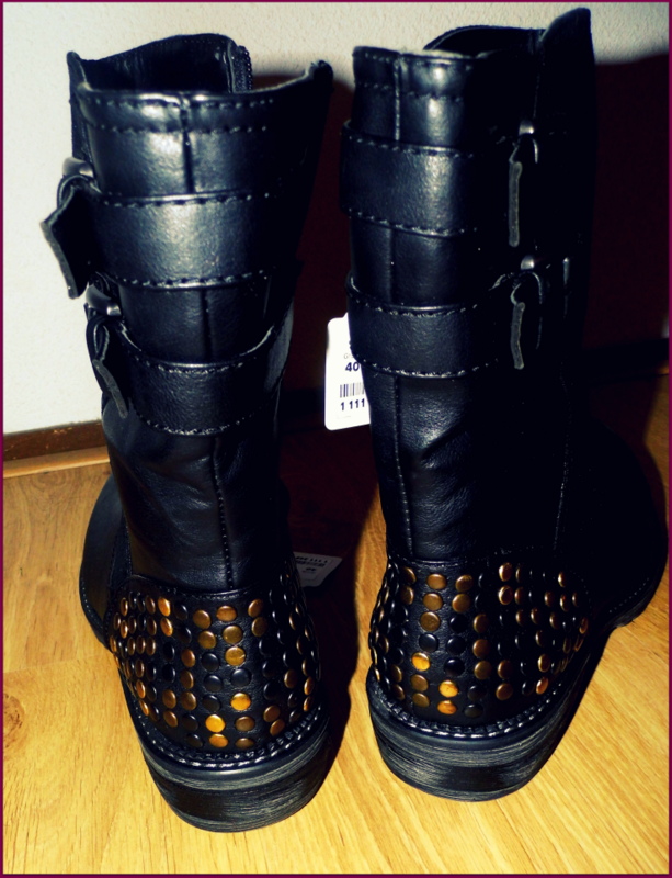 Buty typu motocyklówki.Ciężkie, stylizowane na męskie z czarnymi i złotymi dżetami